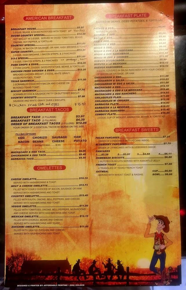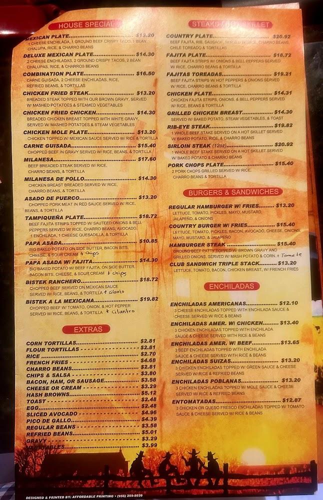 The menu at Country Cafe Restaurant features a mix of traditional Mexican and comforting American dishes. Breakfast shines with items like omelettes, pancakes, and breakfast tacos. Adventurous diners can try local specialties like flautas and enchiladas. Each dish is prepared with care, showcasing fresh ingredients and bold flavors. The lunch and dinner options include a range of soups and salads, alongside hearty plates like fajitas and burgers.